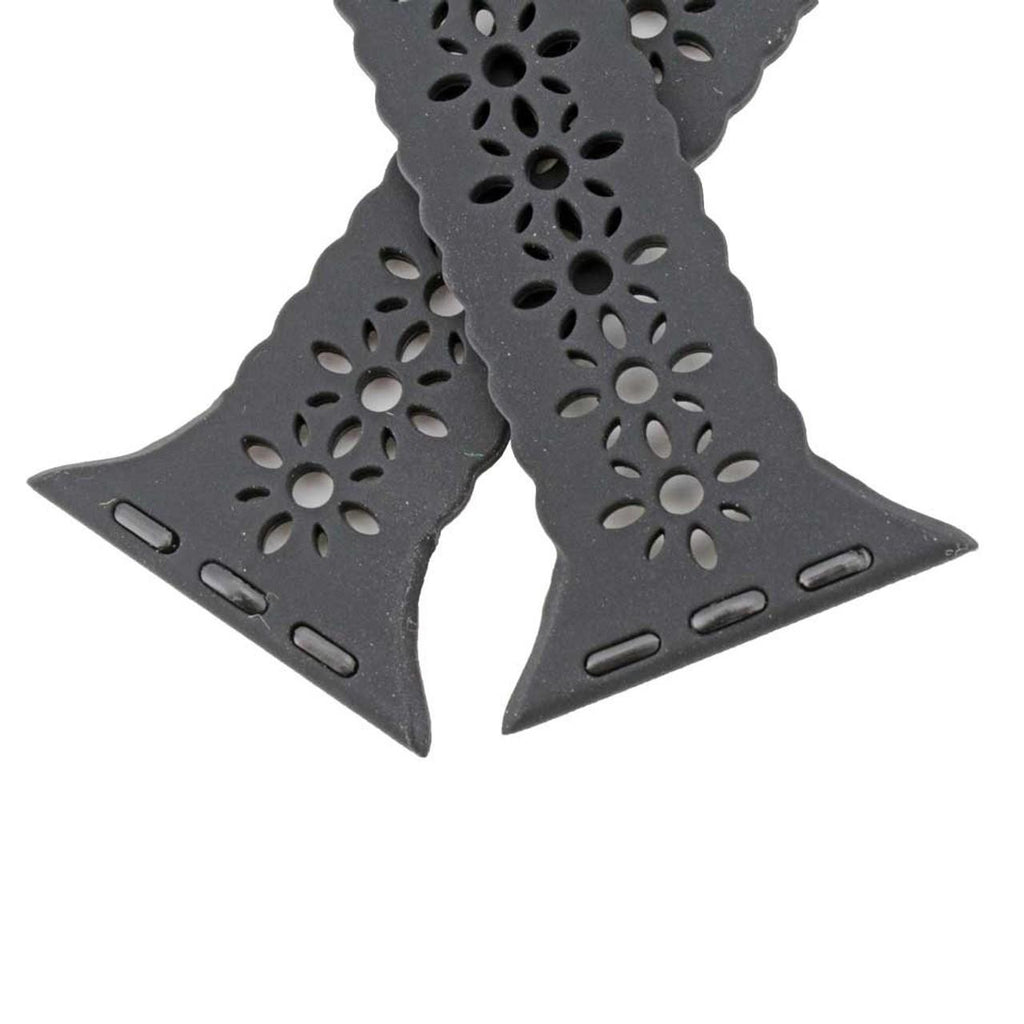Elevate your Apple watch style with our Black Lace Silicon Band! Crafted with flower-shaped cutouts and durable black silicon, this dressy sport band allows you to customize your watch for both function and fashion. Upgrade your everyday look now!
