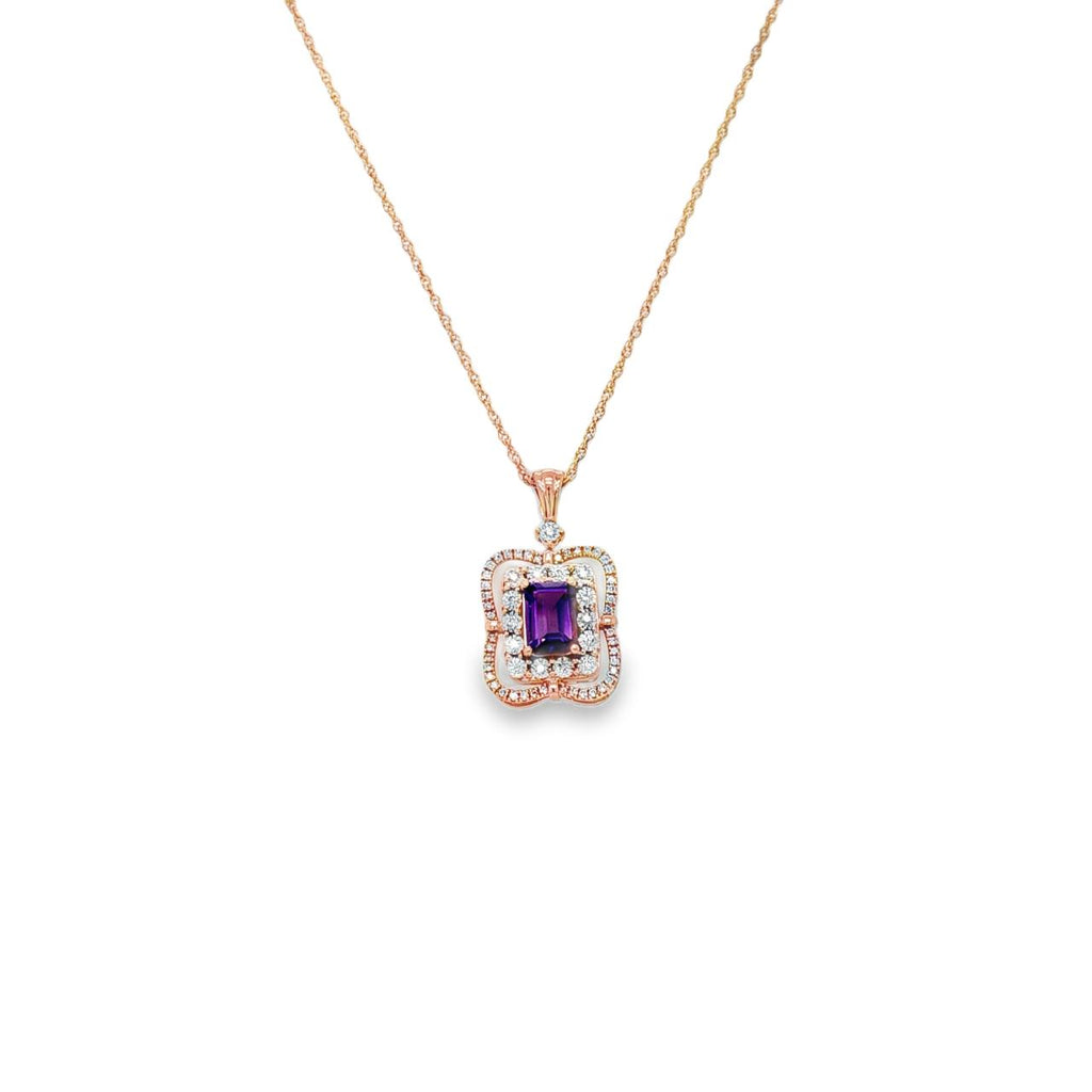 This exquisite butterfly-shaped pendant features a vibrant amethyst centerpiece surrounded by sparkling diamonds, all set in warm rose gold. The combination of these elements creates a refined and elegant piece that captures light beautifully, making it a sophisticated addition to any jewelry collection. Perfect for those who appreciate expert craftsmanship and timeless design.