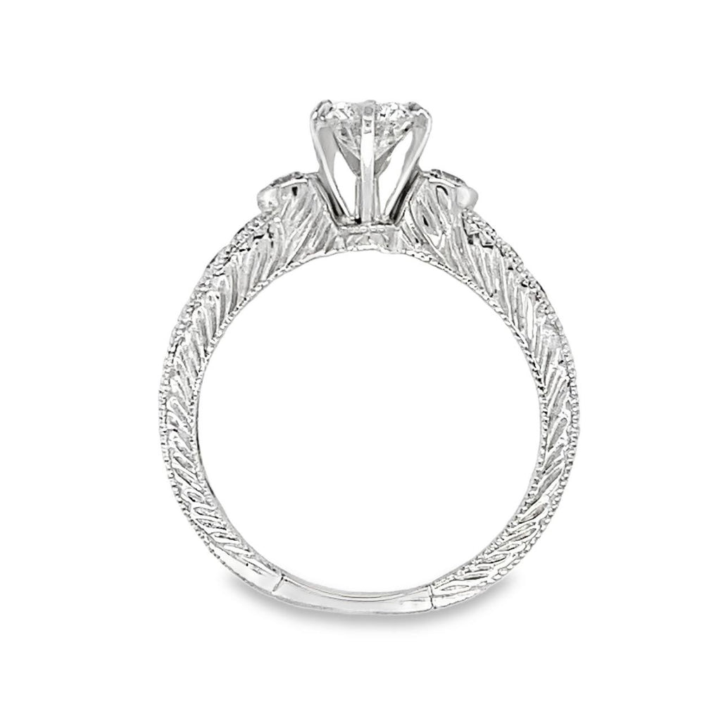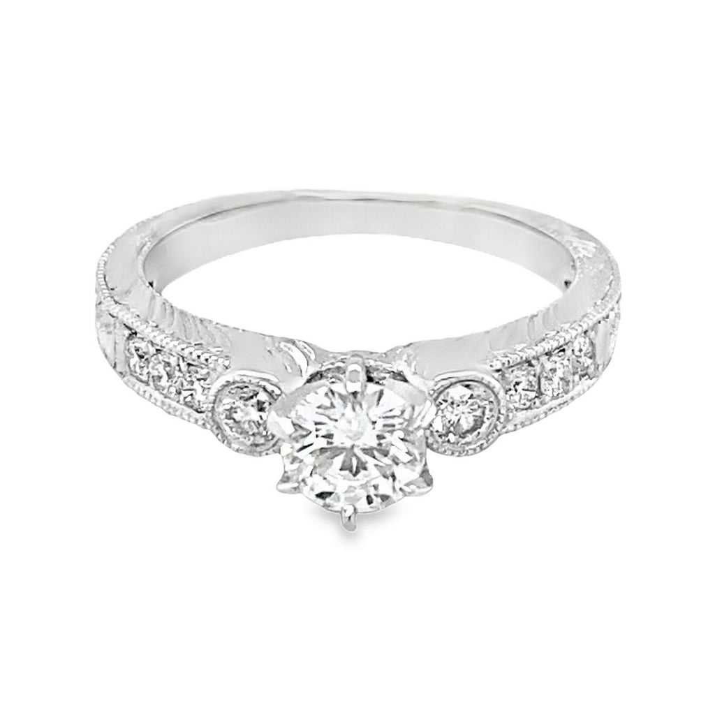 Fall in love all over again with our stunning engraved engagement ring! Expertly crafted from luminous white gold and accented with sparkling diamonds, this ring is truly one of a kind. The intricate engravings and secure bezel setting make it both breathtakingly beautiful and enduring. Make your special moment even more memorable with this exquisite ring.