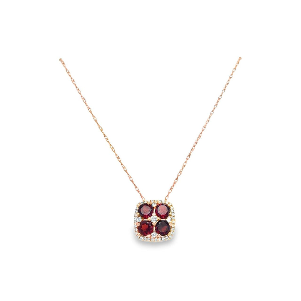 This cushion-shaped pendant features four vibrant garnets artfully arranged and framed by a sparkling diamond halo, all set in luxurious 14k rose gold. The design expertly combines rich red tones with brilliant diamonds, offering a refined and elegant piece that exemplifies superior craftsmanship and timeless style.