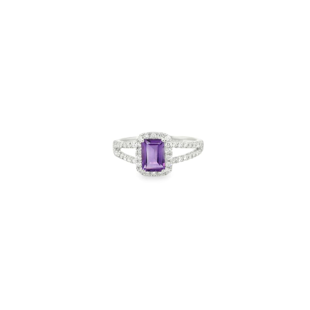 This elegant ring features a striking emerald-cut amethyst, beautifully framed by a halo of sparkling diamonds. Crafted in lustrous 14k white gold, it combines timeless design with refined sophistication, making it a perfect statement piece for any occasion.