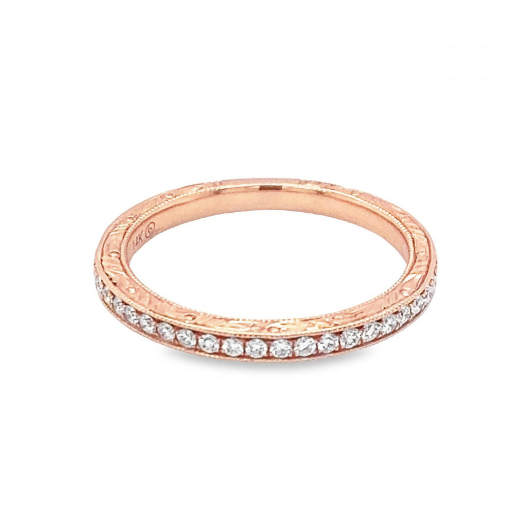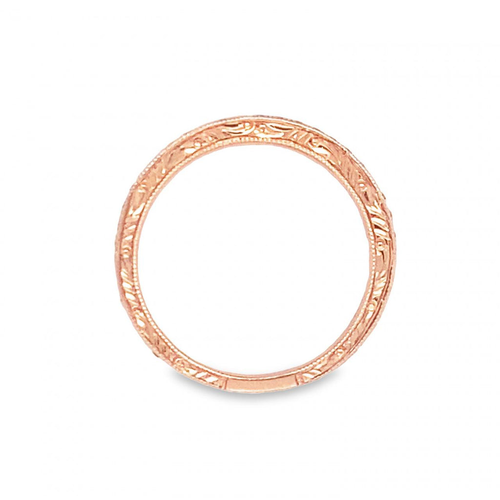 Add a touch of vintage beauty to your wedding or anniversary with our Engraved Diamond Band in Rose Gold. The delicately engraved sides and milgrain details showcase the romantic pink gold, perfect for stacking with other bands. Create a timeless symbol of love with this stunning ring.