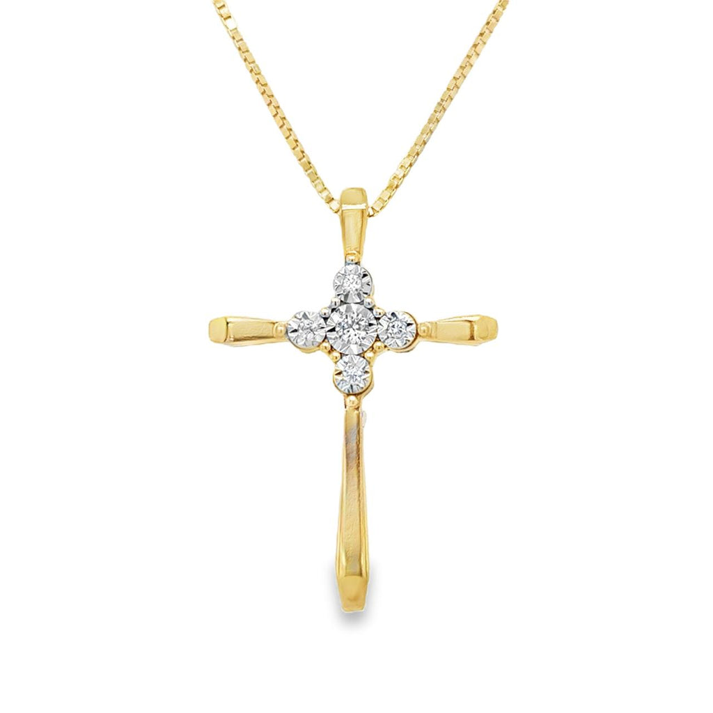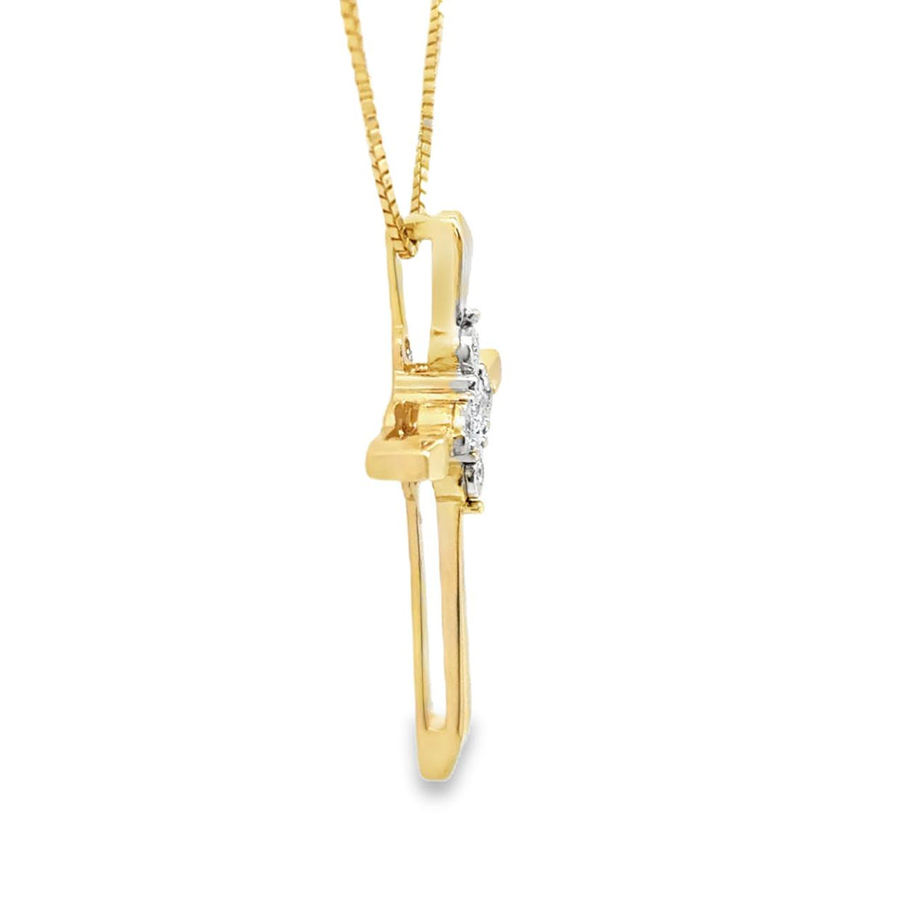 Enhance your style and express your faith with our Estate Diamond Cross necklace. Five natural diamonds sparkle in illusion settings, set in two-tone yellow and white gold. The hidden bail simplifies the look of this estate piece, making it a timeless addition to any jewelry collection.
