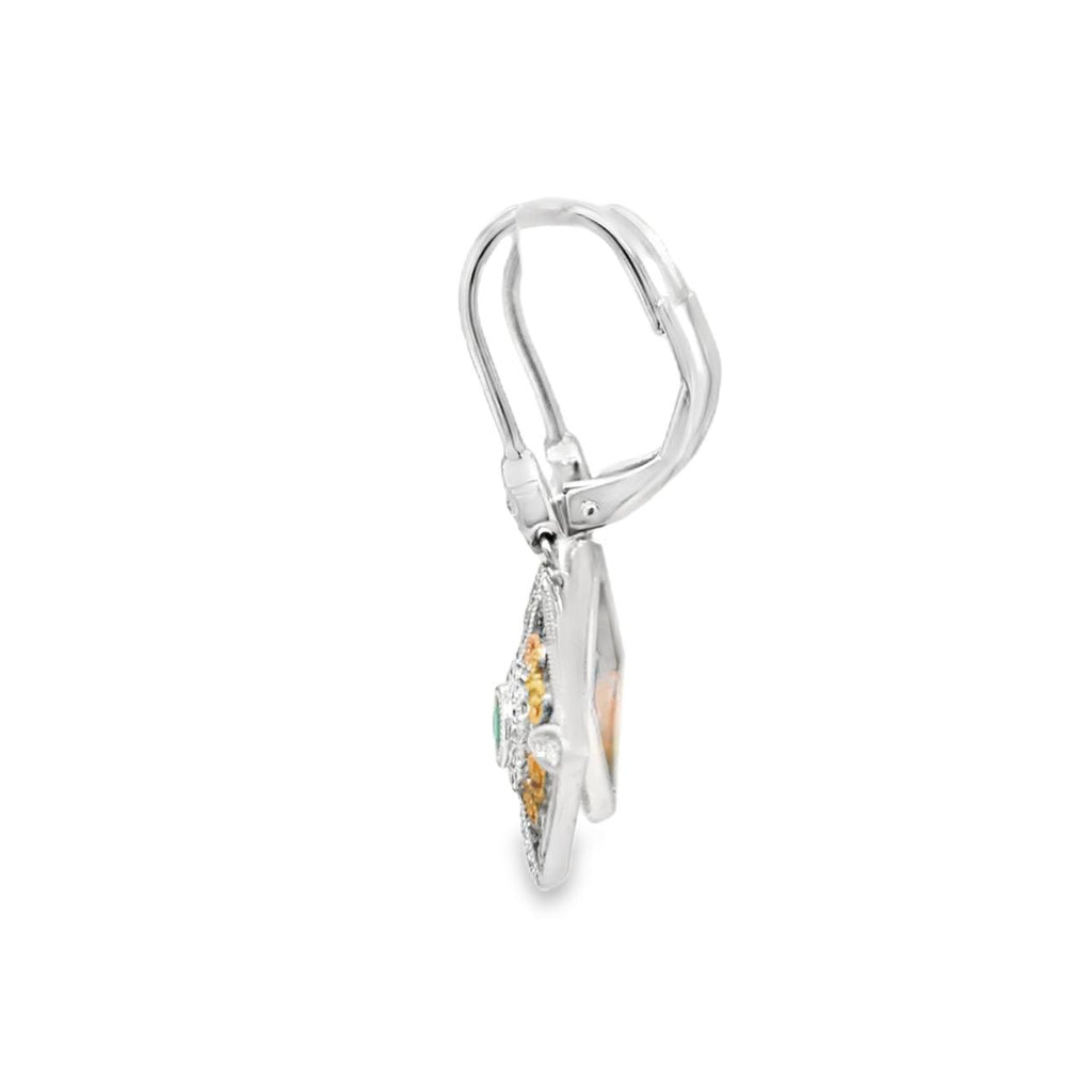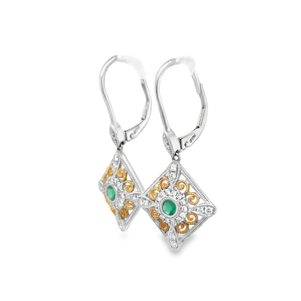 Indulge in sophistication with our Emerald Two-Tone Filigree Earrings. Bezel-set round emeralds and sparkling diamonds set in white gold come together in vintage-inspired dangle earrings. Yellow gold filigree adds an elegant touch to these exclusive, artfully-crafted pieces. Elevate any look with these luxurious earrings.