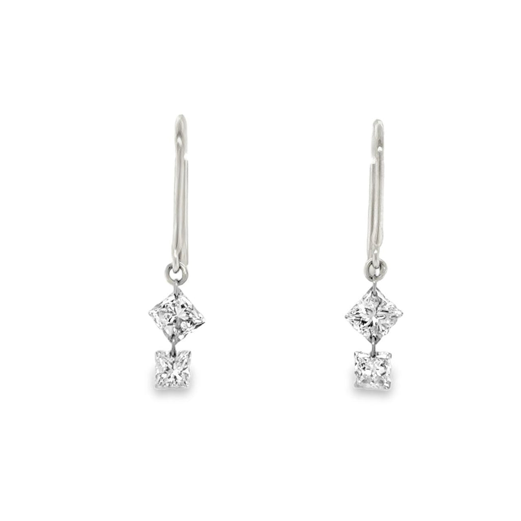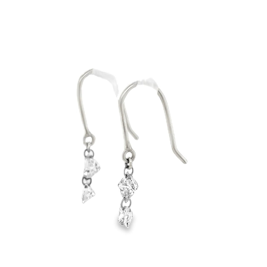 Experience the ultimate elegance with our Loose Princess-Cut Diamond Dangle Earrings. The sparkling princess-cut diamonds are drilled through to dangle effortlessly, held only by sleek jump rings. Crafted in luxurious white gold, these earrings hang from classic French hooks for a timeless look. Make a statement with these stunning earrings!