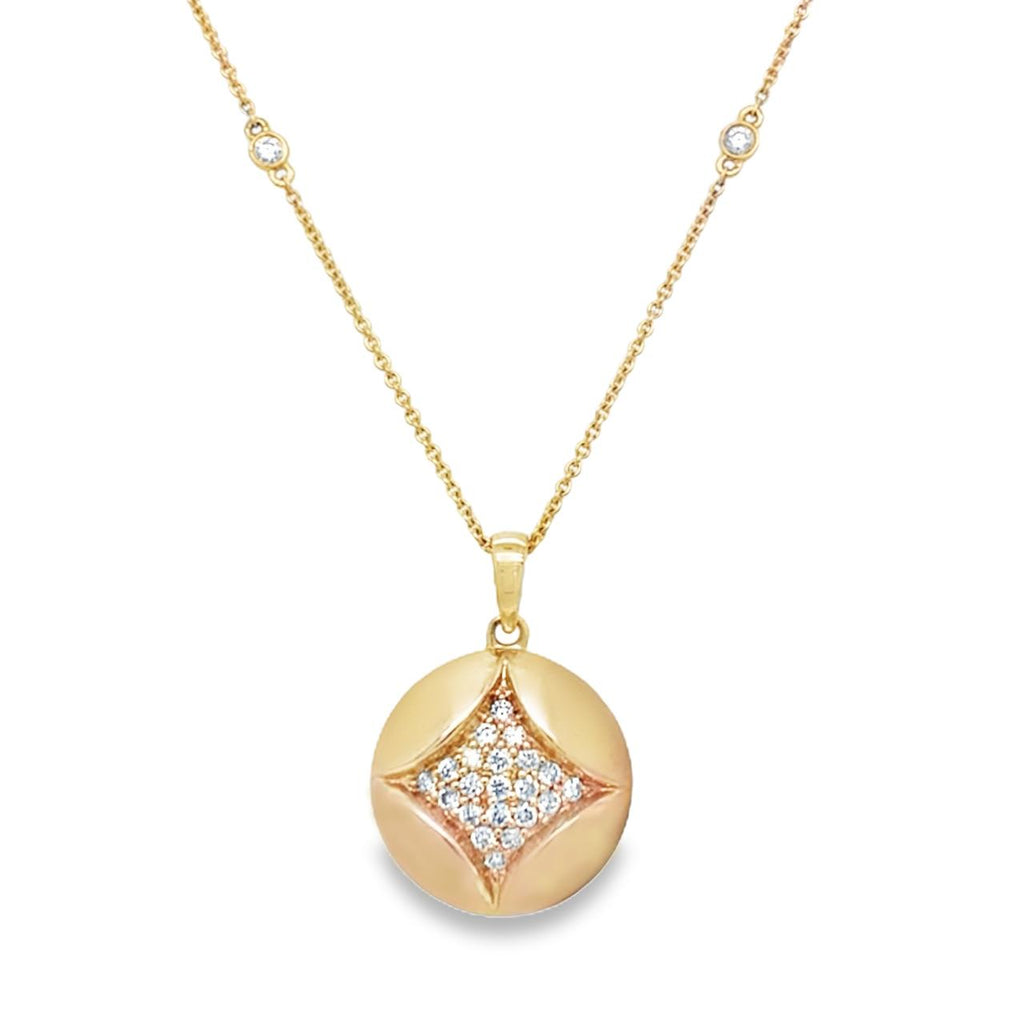 Shine bright with our stunning Pavé Diamond Necklace! The domed circle pendant features a concave four-pointed star with dazzling pave-set diamonds, while the adjustable chain boasts bezel-set diamonds for an extra touch of luxury. Crafted in yellow gold with a satin finish, this geometric masterpiece is sure to turn heads. Elevate any outfit with this must-have accessory!