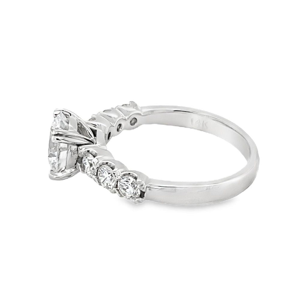 This luxurious semi-mount engagement ring features a secure fishtail setting for added durability and side diamonds for enhanced elegance. The semi-set mounting allows for customization with your own stone. Made of elegant white gold with a center stone split prong setting, this ring is a perfect choice for any discerning individual seeking a truly exclusive piece.
