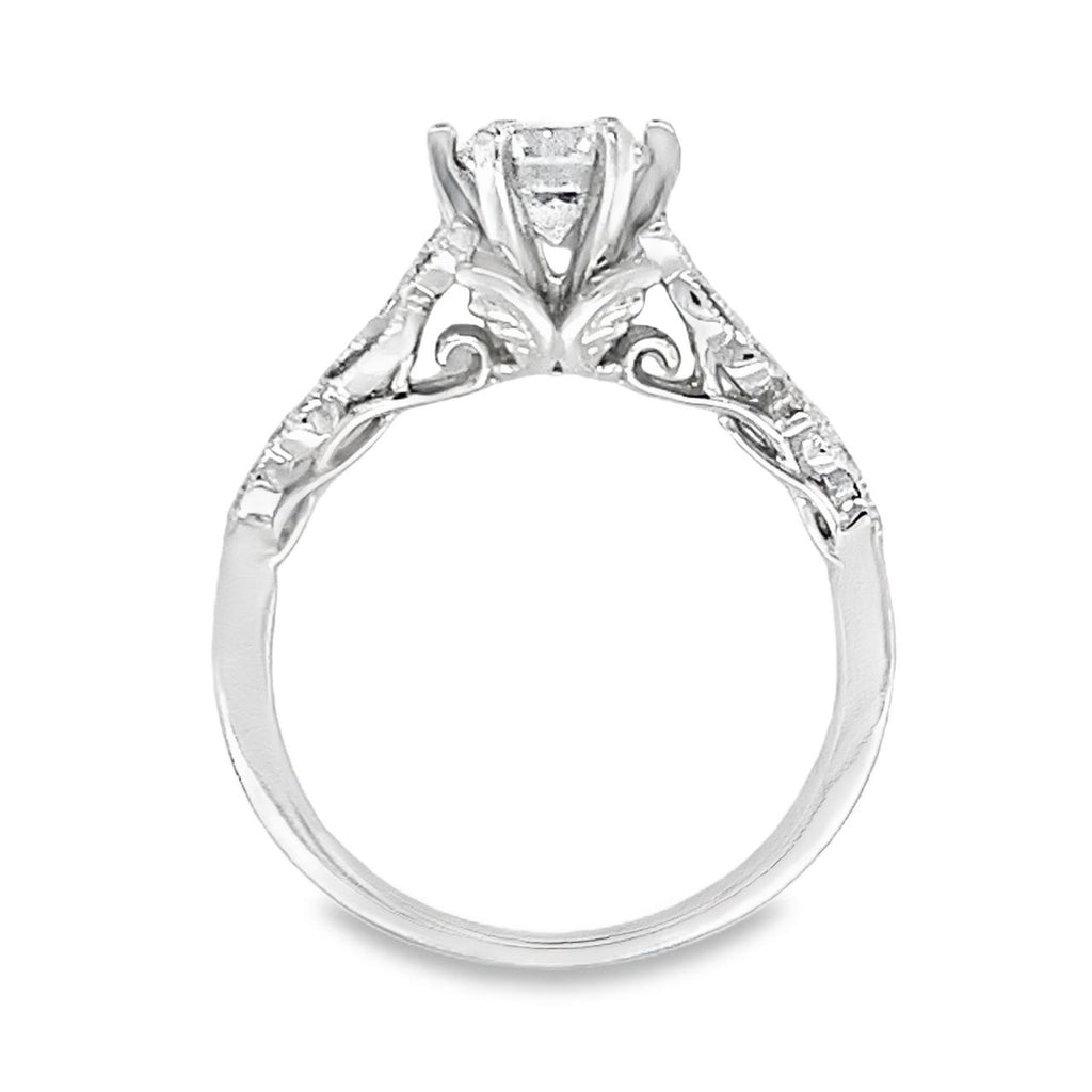 Discover the beauty of our Swirl Filigree Semi-Mount Engagement Ring! Adorned with delicate leaf-like filigree swirls and vintage-inspired milgrain, this ring is a dazzling choice. Customize it with your choice of center stone and be amazed by the added sparkle of the side diamonds. Made with love in white gold.
