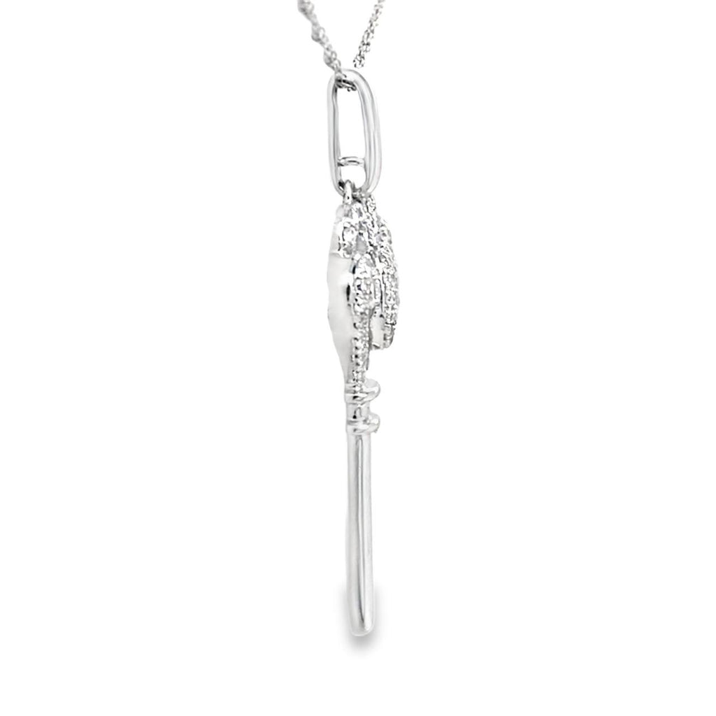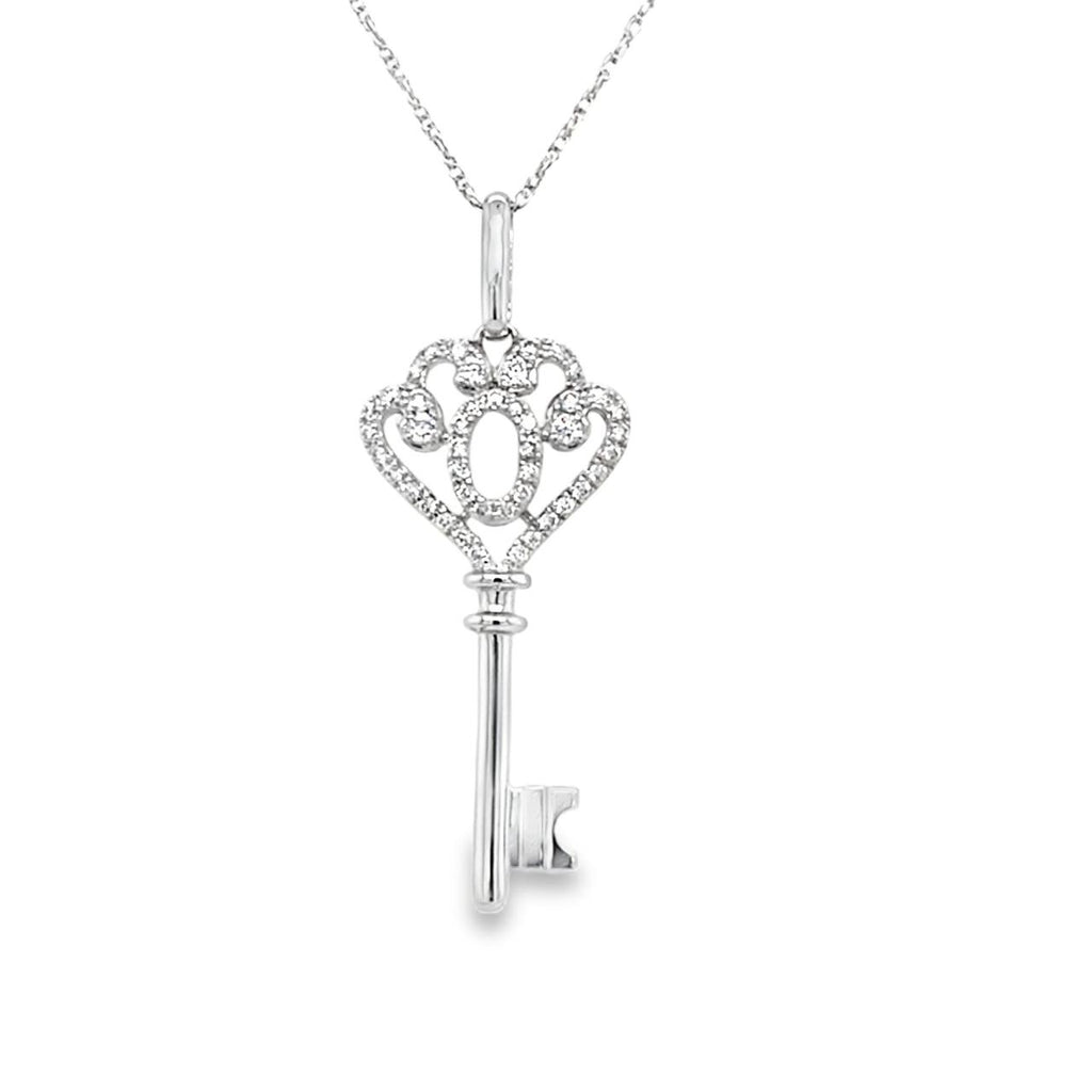 Unlock the love with the Key to Her Heart Diamond Pendant! This elegant white gold key boasts a delicate filigree design adorned with sparkling diamonds, making it a symbol of timeless love. Complete with a chain, it's the perfect gift for your special someone.