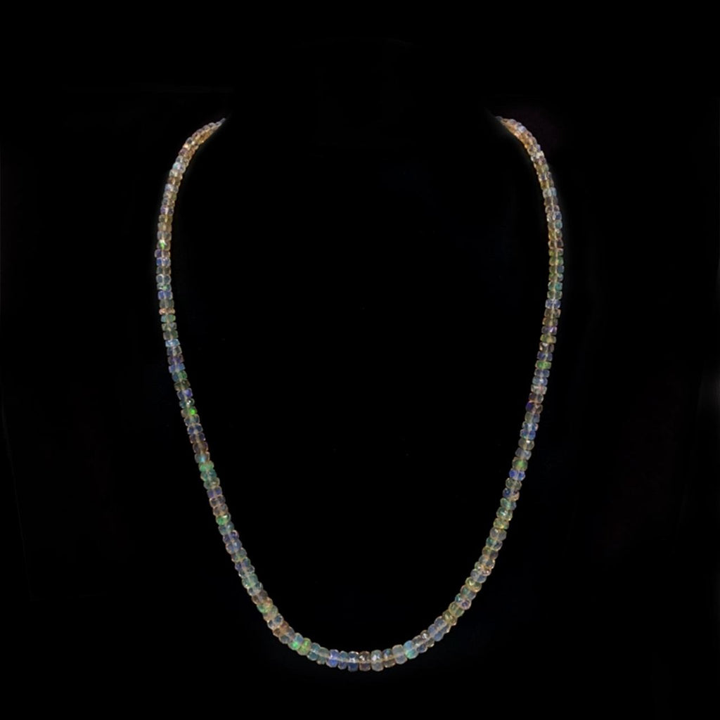 This stunning White Opal Strand Necklace features Ethiopian white opal faceted beads and a sterling silver clasp. Its adjustable length makes it perfect for layering with other necklaces, adding a touch of texture and elegance to any outfit. A must-have for any jewelry collection.