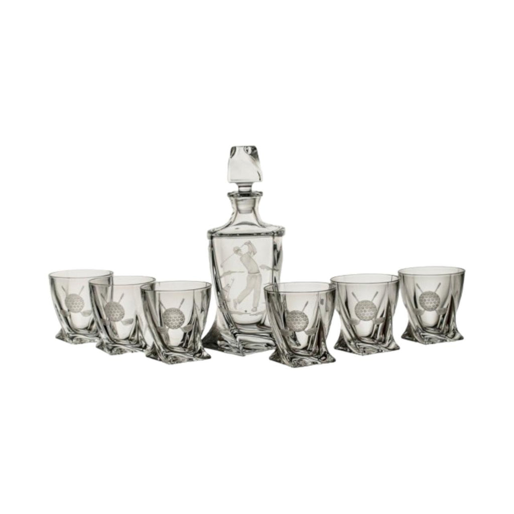 Elevate your love for golf and whiskey with this exquisite Golfing Twisted Crystal Whiskey Decanter Set. Handmade and hand-carved in Poland, this set features a stunning golfing design with a golf ball on each glass. Crafted from 24% lead crystal, it's perfect for impressing your guests or treating yourself to a luxurious experience. Imported and complete with 6 cups and a decanter, this set will elevate your golfing and drinking game.