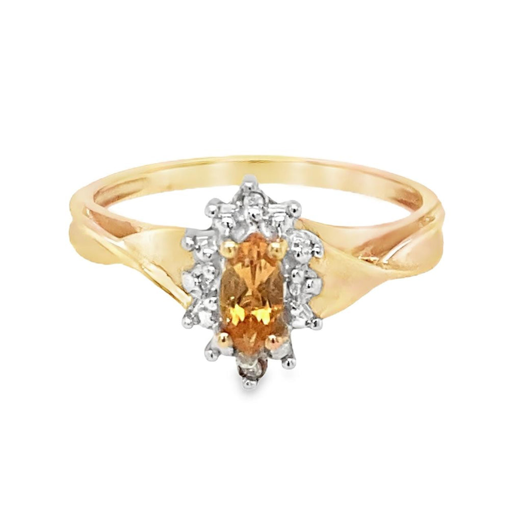 Step back in time with this vintage-inspired ring featuring a beautiful marquise gemstone surrounded by a glittering halo. The elegant bypass design is crafted in yellow gold, making it the perfect birthstone ring for any special occasion. Embrace the timeless beauty and sparkle of this beautiful design.