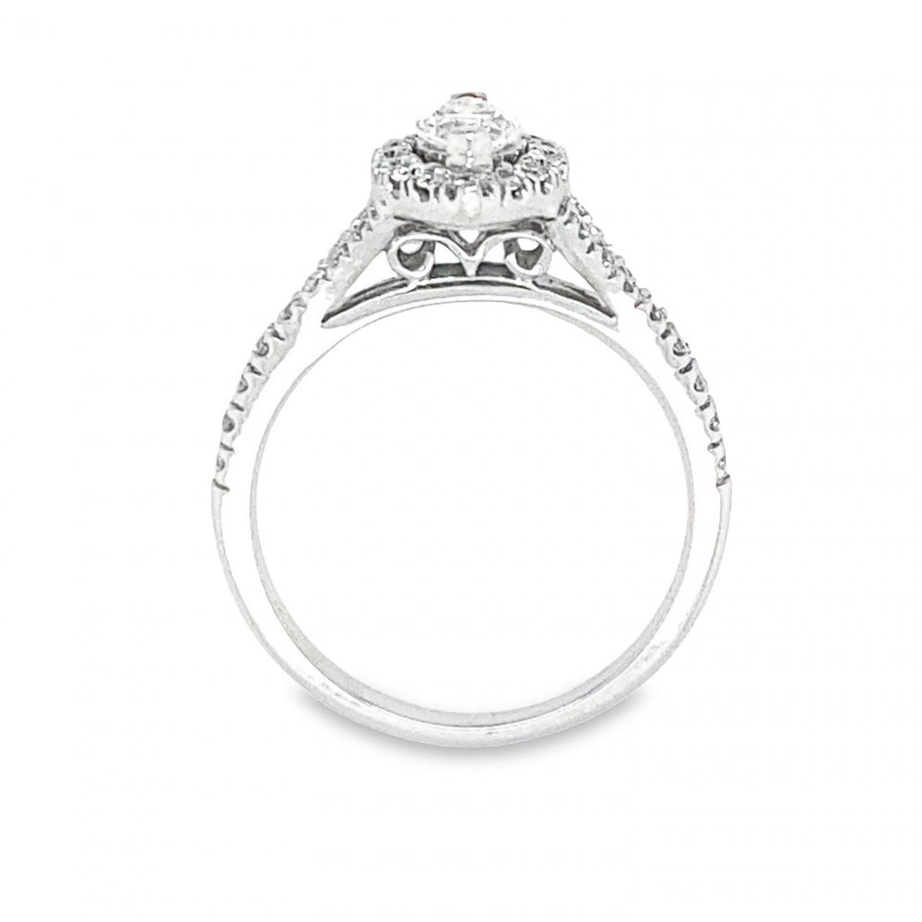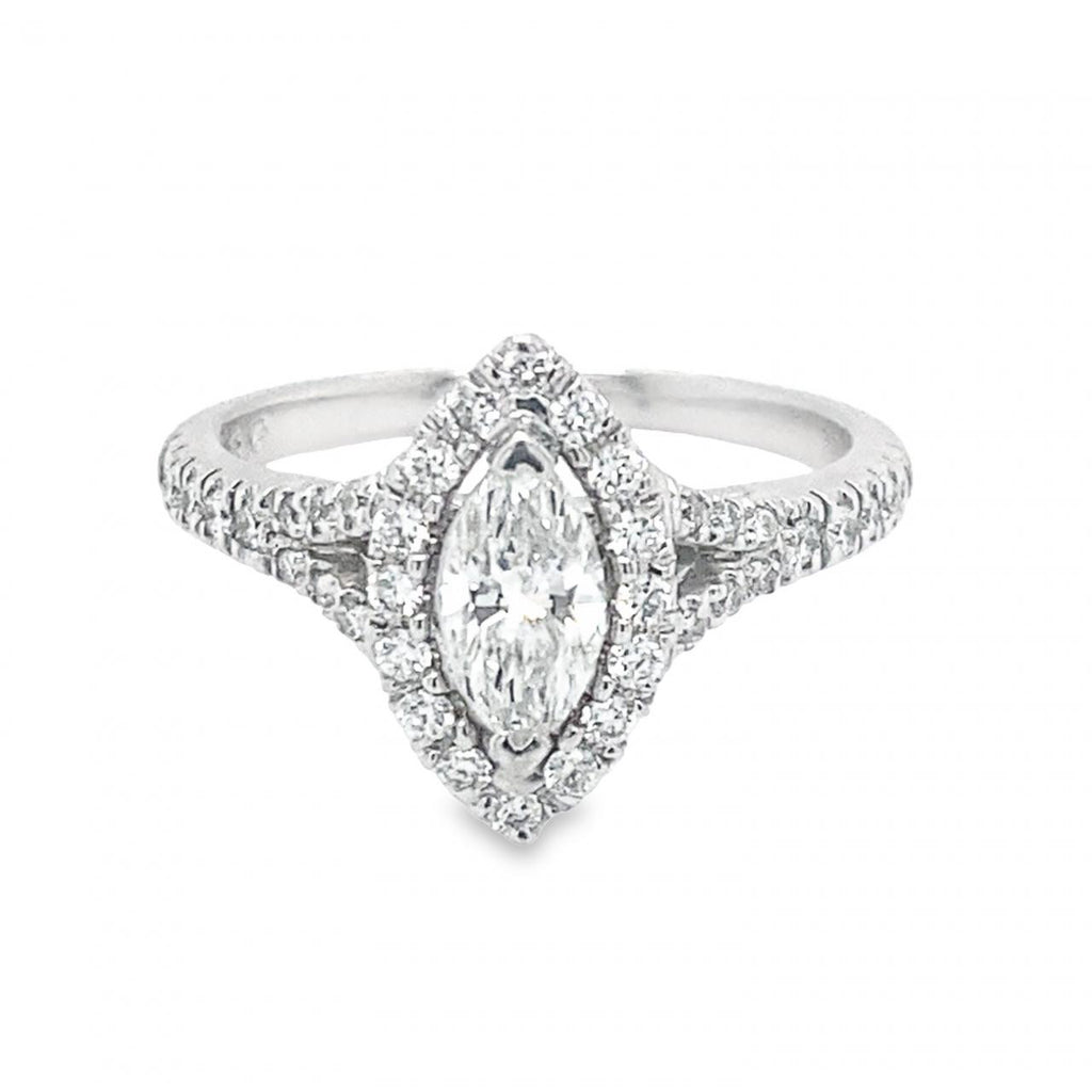 The marquise-cut diamond, known as the queen of cuts, requires more diamond rough to be cut off in order to achieve its unique shape. This stunning ring features a marquise center stone encircled by a sparkling halo of smaller diamonds and boasts elegant scrollwork visible in the gallery.