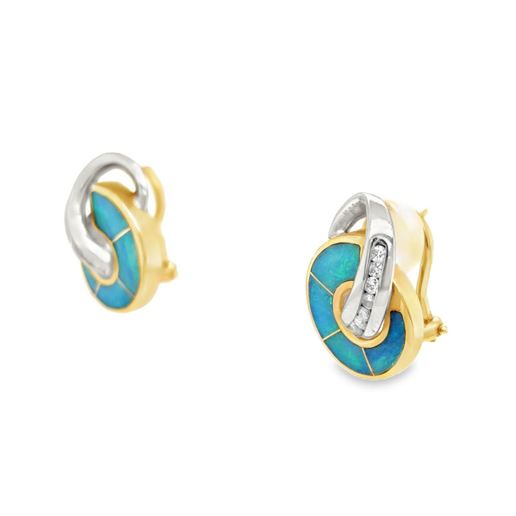 Embrace the beauty of the sea with our Opal Inlay and Diamond Earrings. Featuring a unique shell-like shape and opal inlay with a captivating turquoise hue, these two-tone gold earrings will add a touch of elegance and oceanic charm to any outfit. The channel-set diamonds and swirl design add a touch of sparkle and movement.