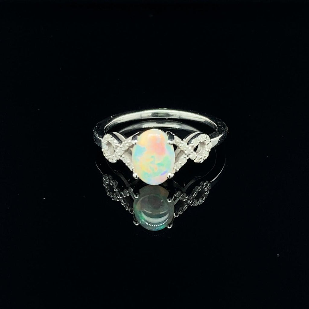 Ribbons of diamonds surround this beautiful oval opal. The delicate white gold setting allows the opal to take center stage.