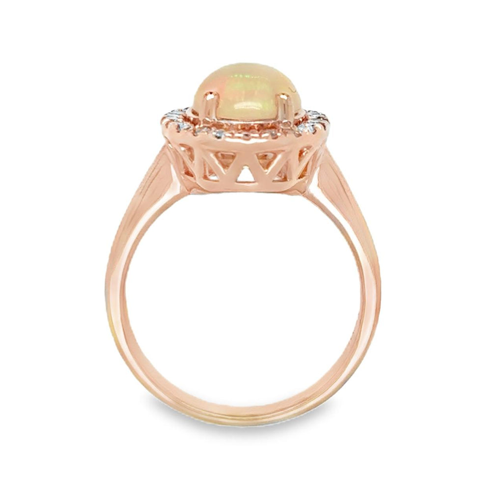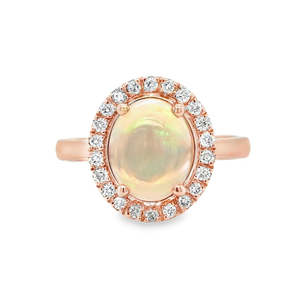 This elegant ring showcases a delicate oval opal cabochon, embraced by a shimmering diamond halo set in rose gold. As October’s birthstone, the opal’s subtle beauty and the refined design create a graceful accessory that adds sophistication to any look.