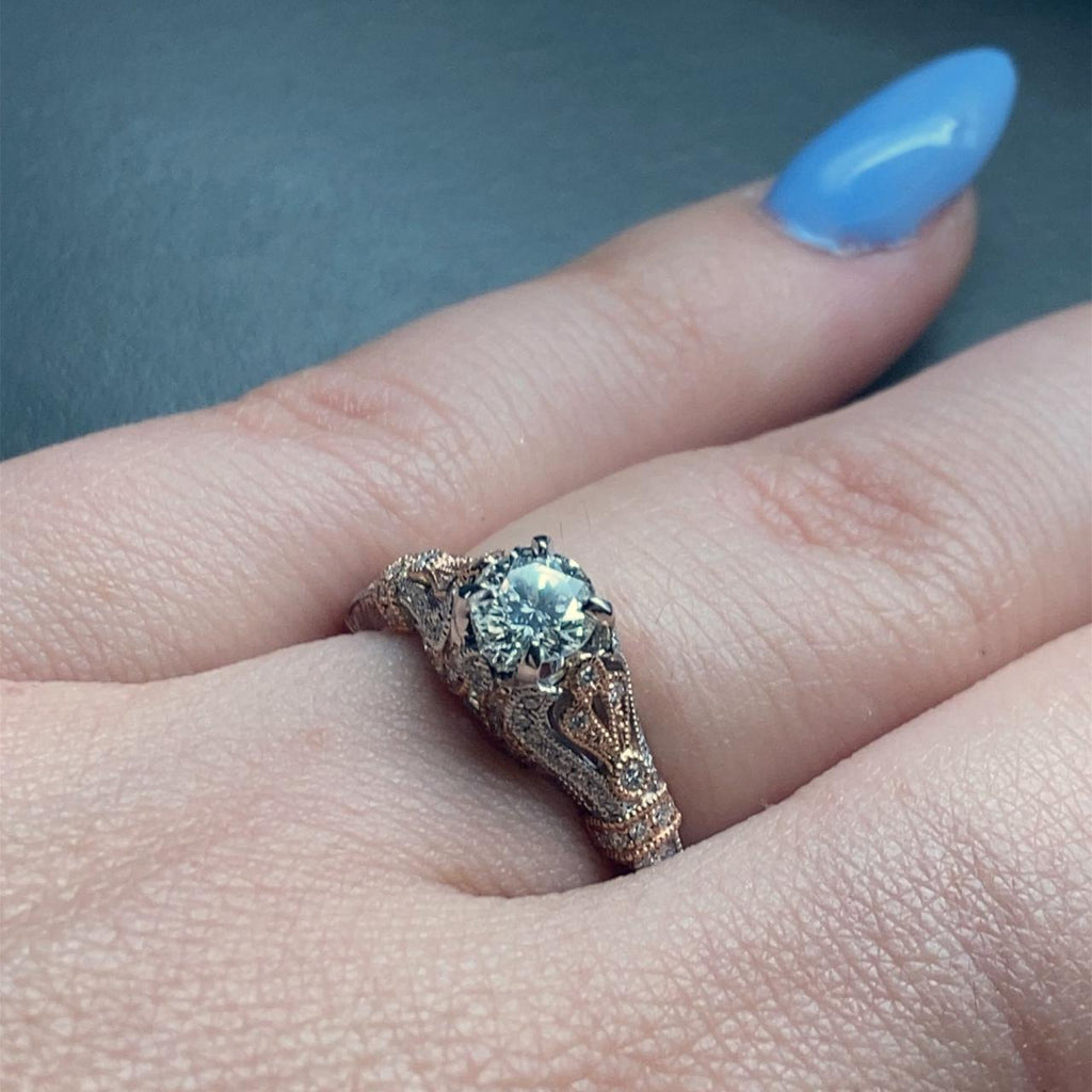 This stunning vintage-style engagement ring is crafted with intricate milgrain and filigree details, adding to its unique beauty. The two-tone rose and white gold enhances the brilliance of the diamond and the thicker shank ensures durability for a lifetime. An elegant choice for a one-of-a-kind proposal.