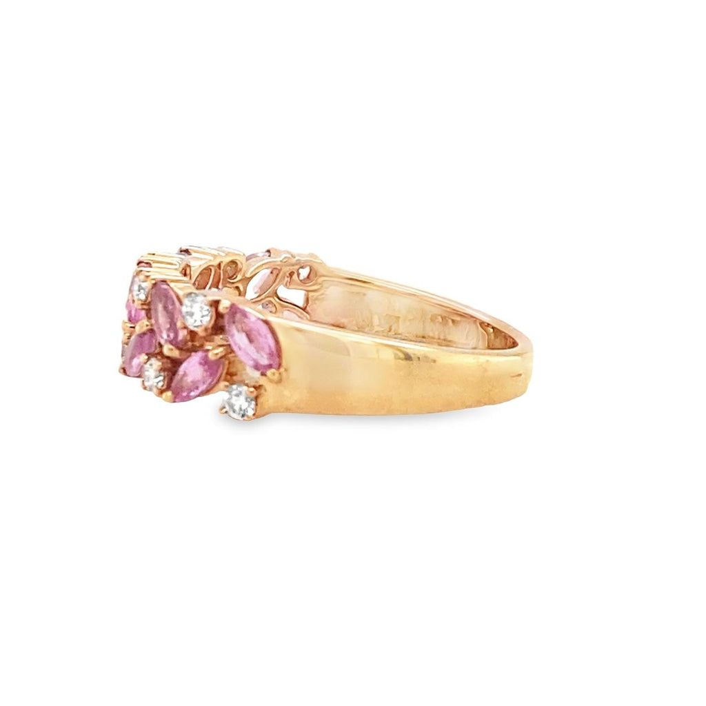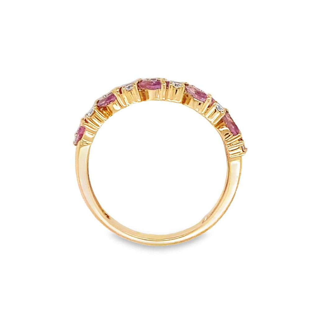 This stunning anniversary band features marquise pink sapphires and sparkling diamonds set in yellow gold. With its low profile design, this ring is perfect for everyday wear and can be stacked with other rings for a personalized look. Celebrate your special milestone in style with this beautiful stackable ring!