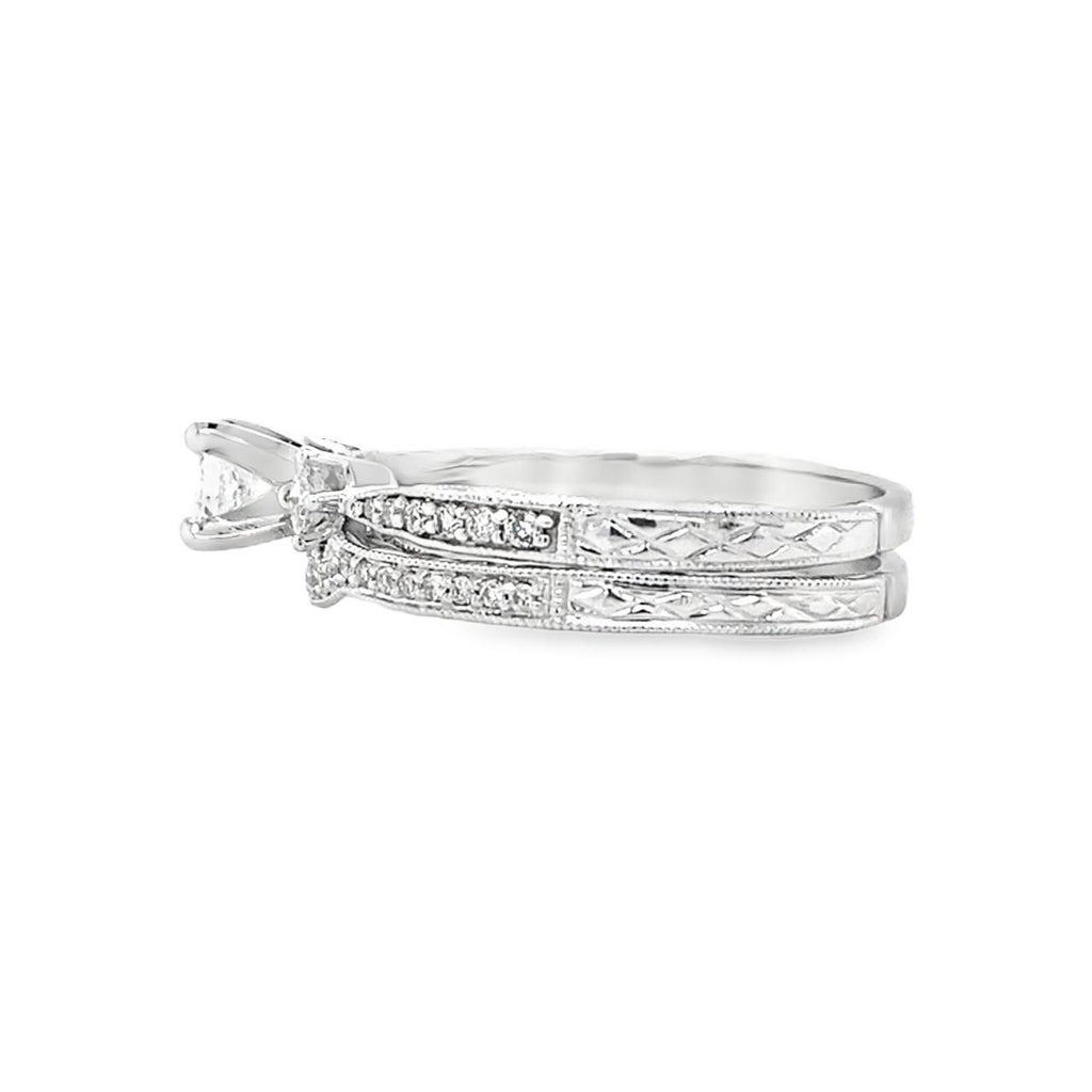 This luxurious wedding set features three stunning princess cut center stones, elegantly designed with engraved side details and milgrain accents. The estate design adds a touch of sophistication, while the white gold and contour band create a timeless and exquisite look. Make a statement on your special day with this premium set.