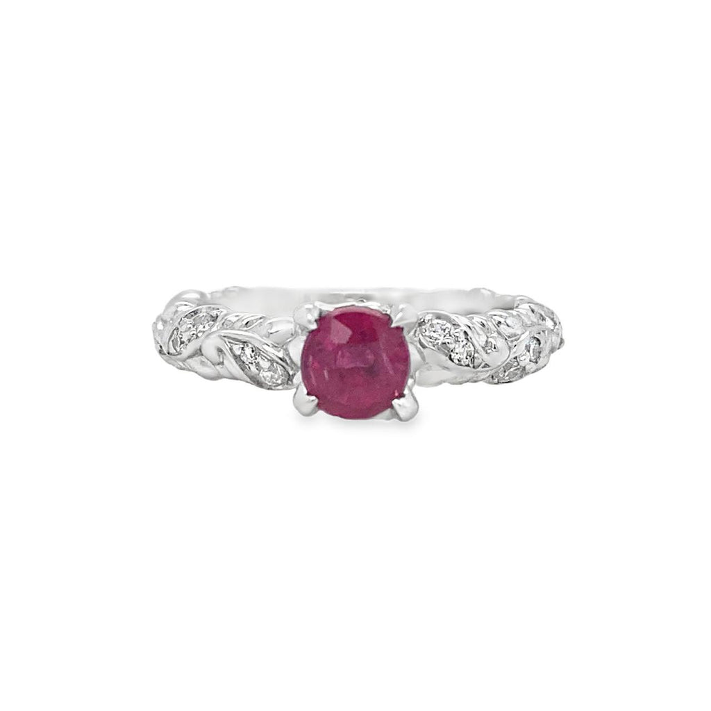 Experience the beauty of nature with our stunning Ruby and Diamond Leaf Ring. The elegant ruby, representing the July birthstone, is complemented by diamond-studded leaves, twining up the shank like a vine. The textural details add an extra touch of nature-inspired charm. Perfect for both everyday wear and special occasions, this ring is a must-have for any jewelry collection.