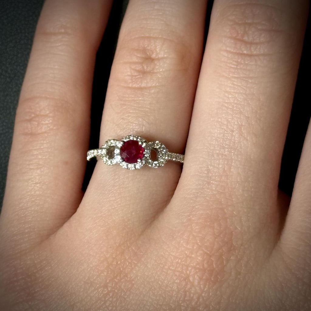 Indulge in the rich, fiery beauty of our Ruby Ring with Halo and Split Shank. Featuring a stunning round ruby set in a halo of sparkling diamonds, and complimented by a split shank design adorned with diamonds, this ring is the perfect embodiment of elegance and luxury. Whether it's for a special occasion or just because, this ring is sure to make a statement and be treasured for years to come. A perfect gift for July birthdays or any lover of exquisite jewelry.