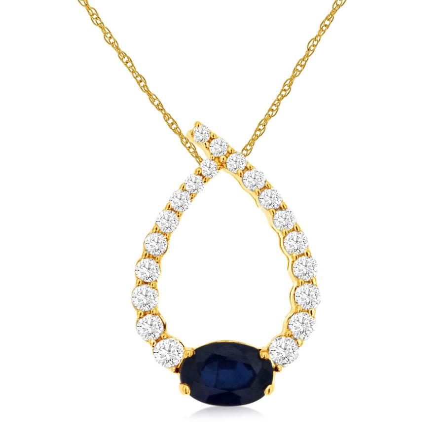 This sophisticated teardrop pendant begins at the top with dazzling diamonds gradually increasing in size, and showcasing a radiant oval-cut blue sapphire at its base. Available in your choice of gold color, this necklace combines classic elegance with modern refinement, making it an exquisite addition to any jewelry collection.