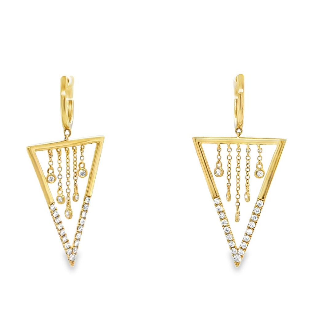 These exquisite triangular chandelier earrings combine geometric precision with luxurious craftsmanship. Crafted in gleaming gold, each earring features a striking triangle design adorned with carefully set diamonds that catch the light from every angle. Perfect for those who appreciate modern elegance and refined detail, these earrings elevate any ensemble with their sophisticated sparkle and architectural form.