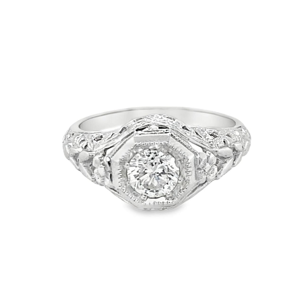 Elevate your style with our Vintage Solitaire Diamond Ring, featuring a beautiful deep-set diamond, protected by intricate filigree cutouts. This white gold ring exudes sophistication and is perfect for any occasion - whether it's a fashion statement or an engagement ring. Add a touch of class to your look today!