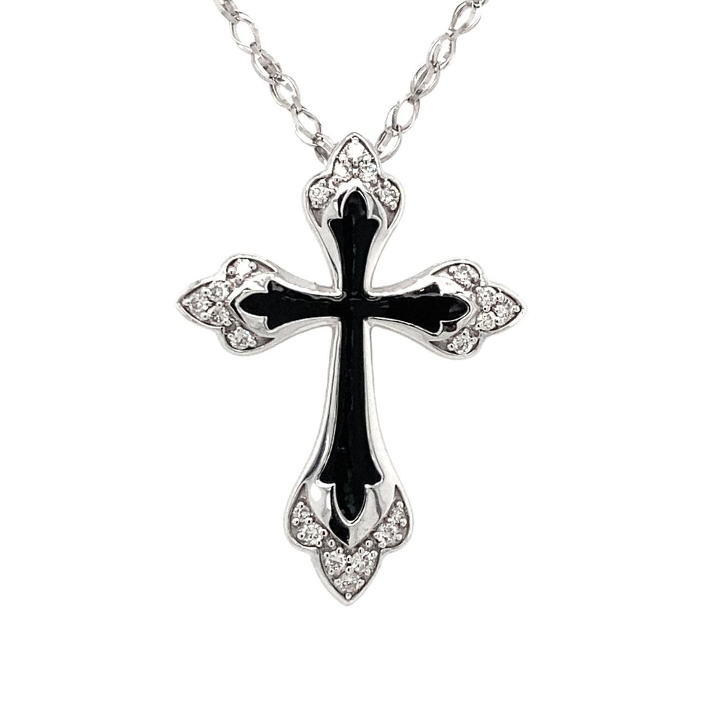 Add a touch of Gothic flair to your wardrobe with our White Gold Cross. Featuring bold black enamel and sparkling diamonds at the ends, this cross is a unique and eye-catching accessory. Perfect for those who like to stand out from the crowd!